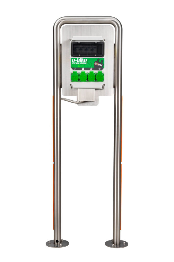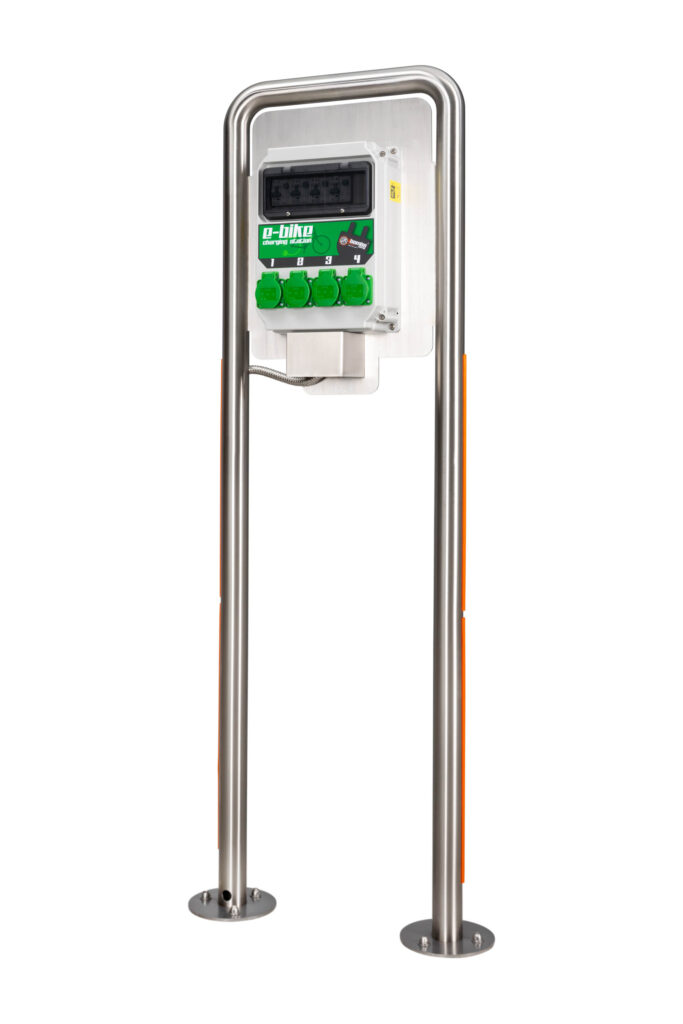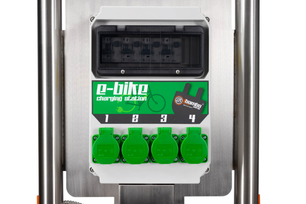 El cargador está diseñado para cargar bicicletas eléctricas y no se puede conectar a nada con mayor potencia. Es adecuado para su uso en lugares públicos. Tiene 4 enchufes para la conexión y protecciones sensibles contra sobrecorriente residual cumplen con todos los estándares de la UE responsables del uso de enchufes por parte de personas no autorizadas o no calificadas. El acceso al módulo de carga y a los fusibles se asegura mediante tornillos de seguridad.