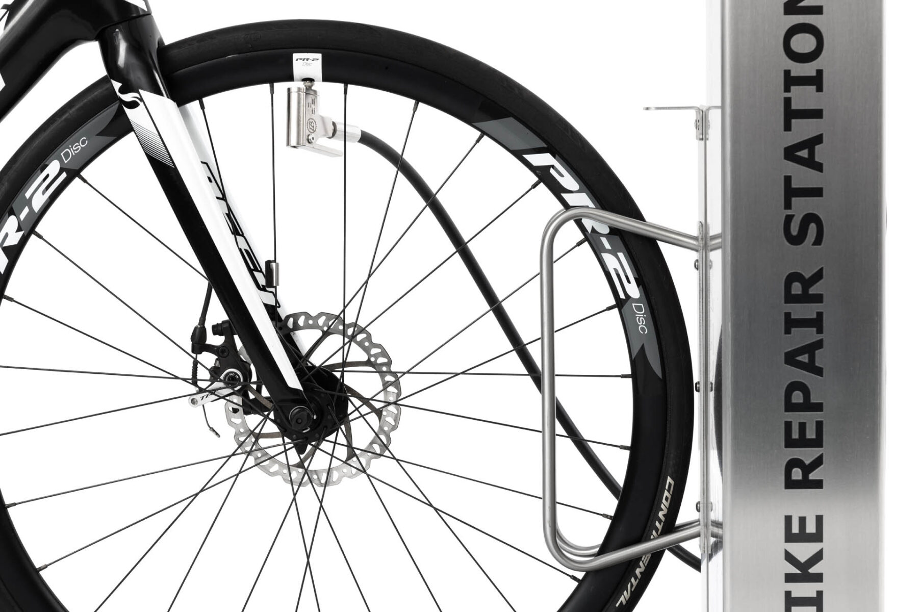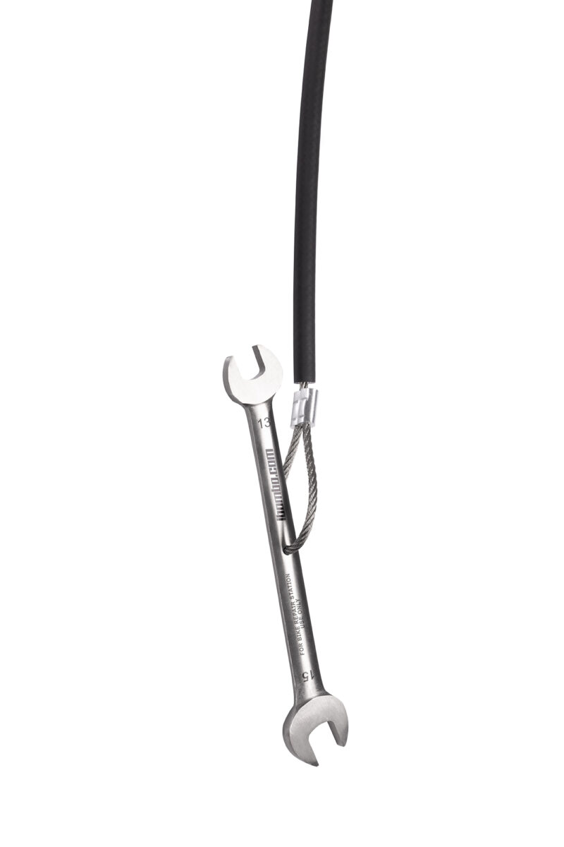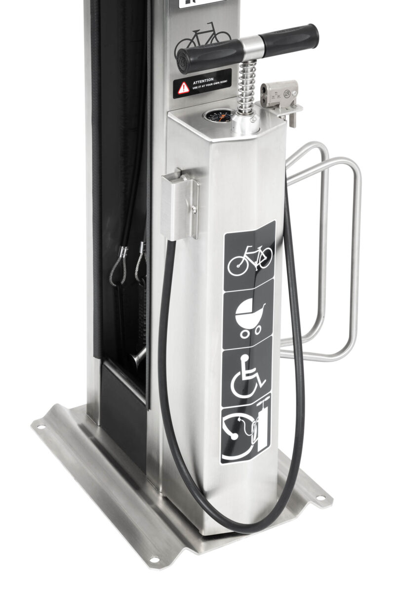 La carcasa del dispositivo está fabricada en acero galvanizado o inoxidable (AISI 304) con recubrimiento en polvo o termoplástico. Las herramientas están sujetas a cuerdas de acero inoxidable que cuelgan dentro de la columna de la estación; la longitud de las cuerdas permite llegar a todos los componentes de la bicicleta. El revestimiento de caucho de los cables evita que las herramientas se enreden y protege el cuadro de la bicicleta contra rayones. La estación está equipada con una bomba manual con un adaptador para todos los tipos de válvulas. La construcción de la estación te permite colocar la bicicleta en el mango, para que puedas girar fácilmente la manivela mientras reparas la bicicleta.