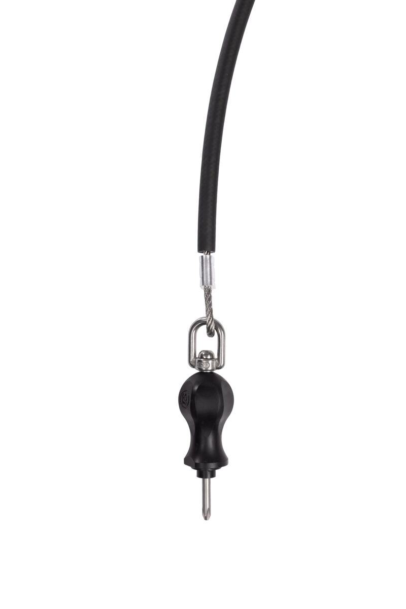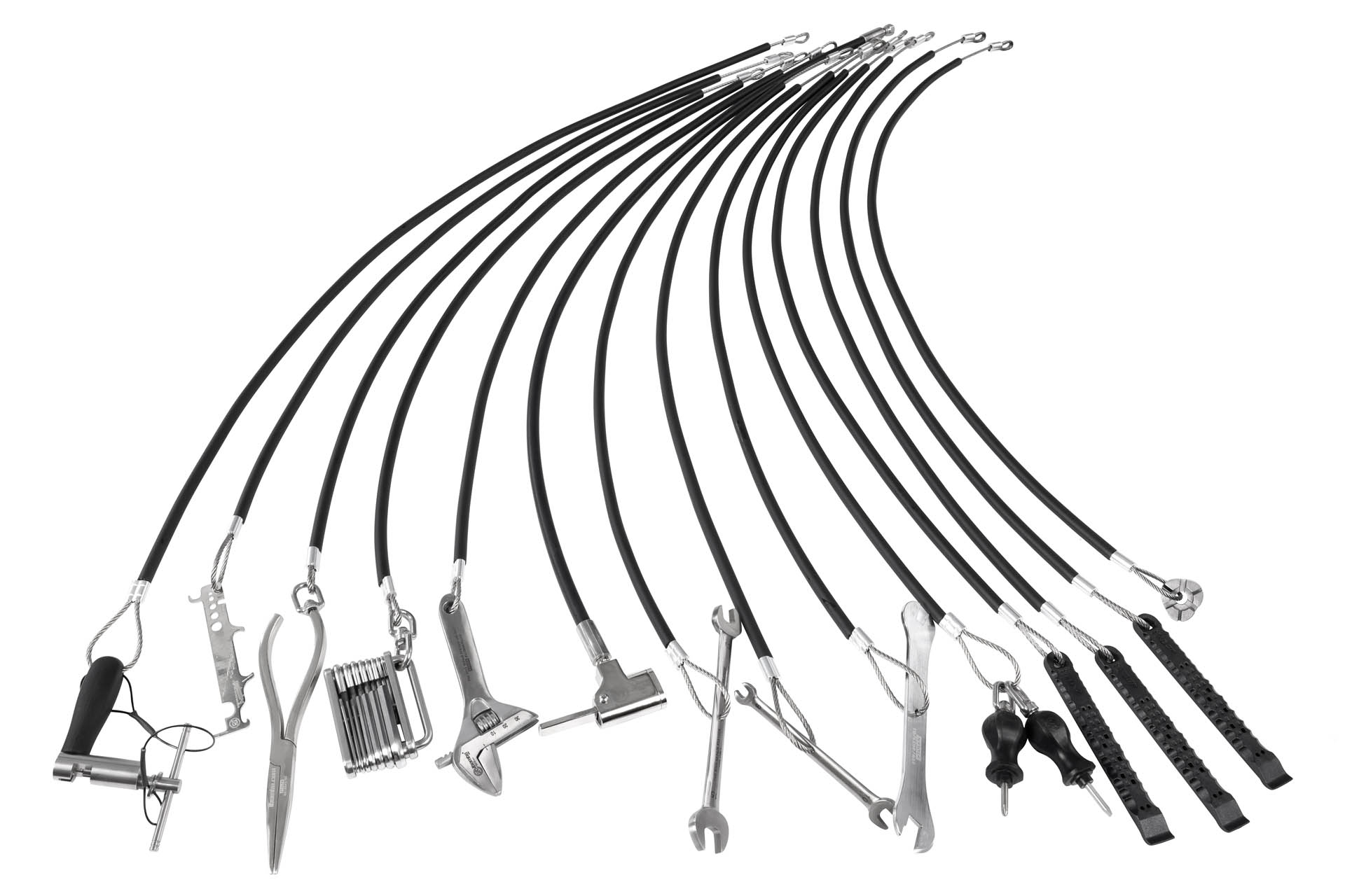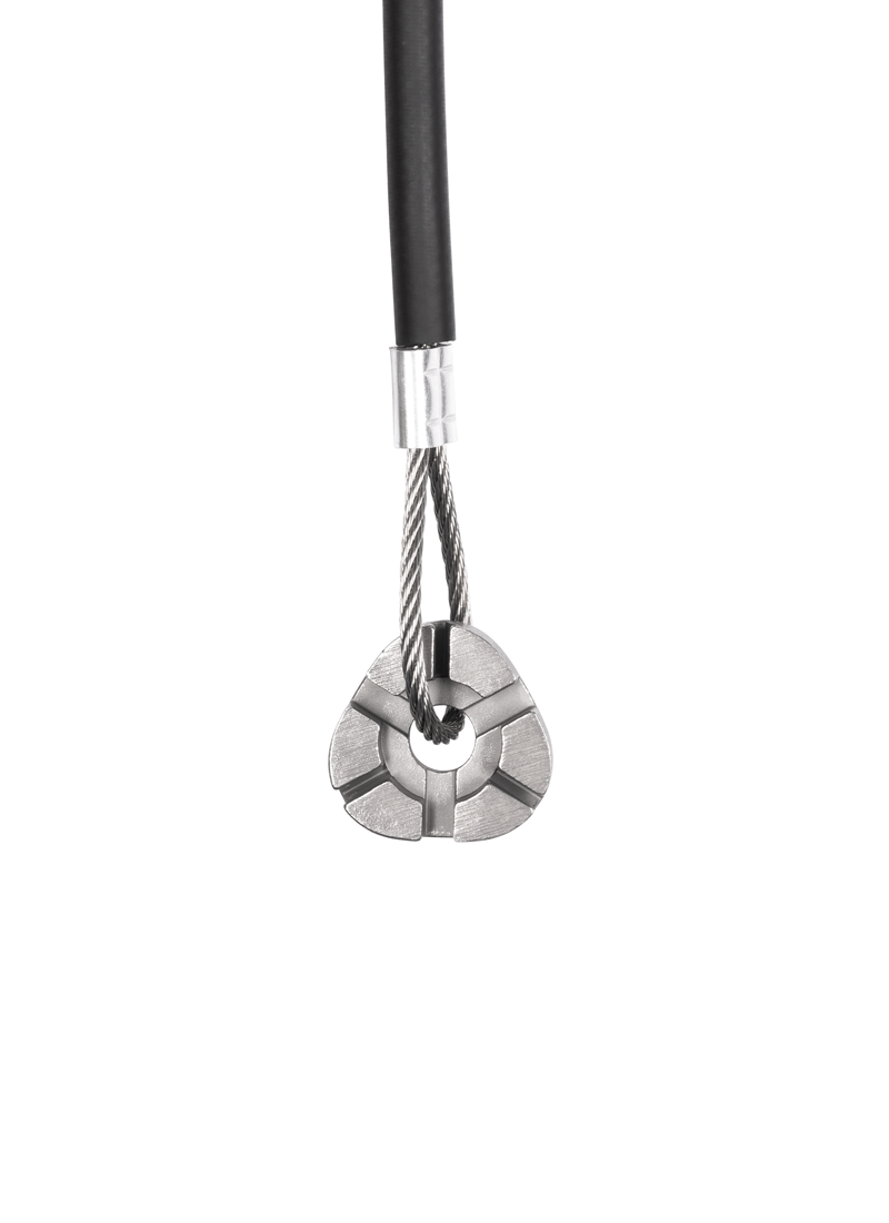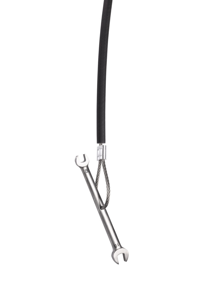 herramientas montadas en cables de aviación (7×7 multitorón, Ø 4 mm) fabricados en acero inoxidable marino AISI 316, cables protegidos por una cubierta de caucho flexible y terminados con engarces de máquina precisos hechos de manguitos de aluminio niquelado.