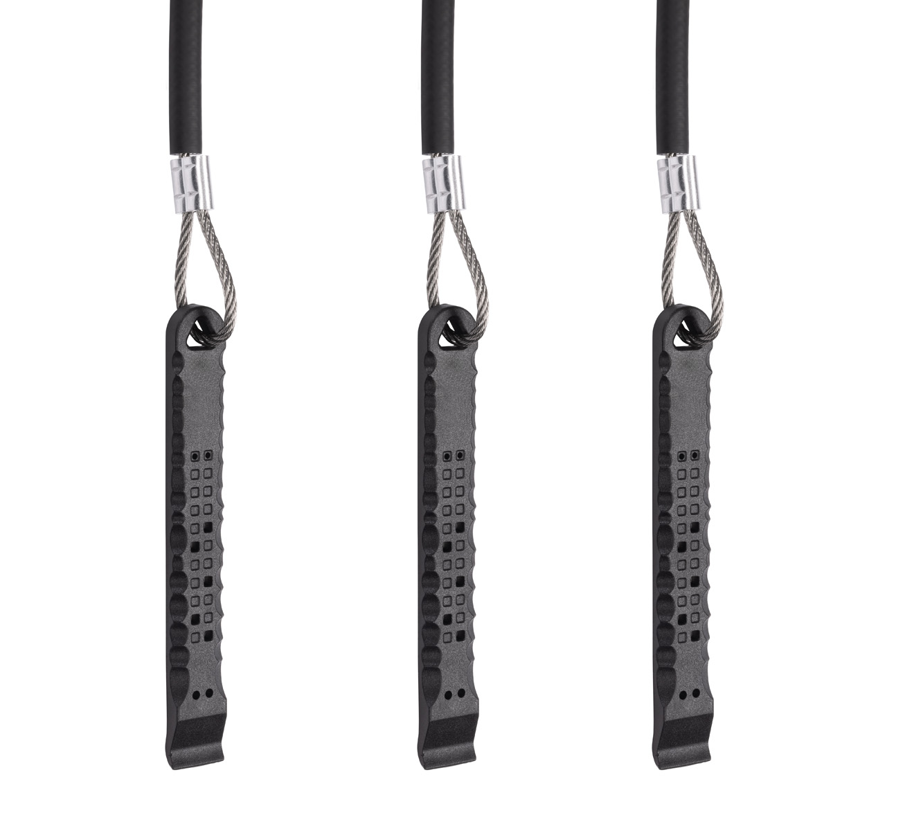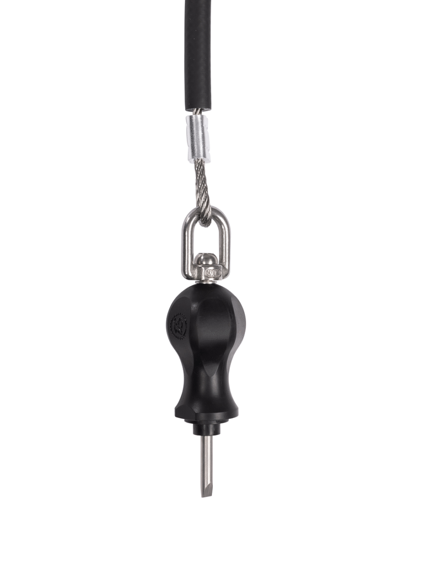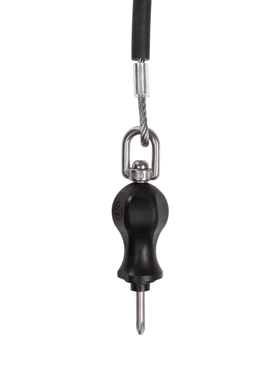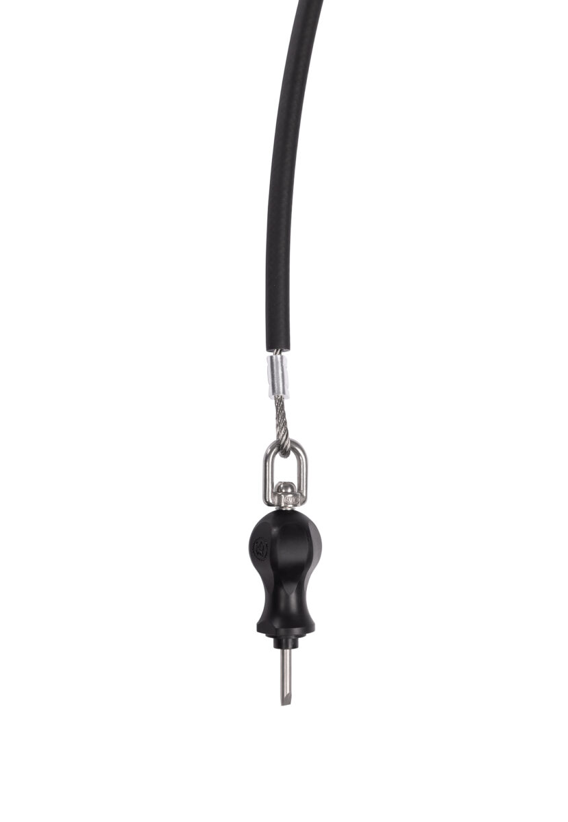 herramientas montadas en cables de aviación (7×7 multitorón, Ø 4 mm) fabricados en acero inoxidable marino AISI 316, cables protegidos por una cubierta de caucho flexible y terminados con engarces de máquina precisos hechos de manguitos de aluminio niquelado.